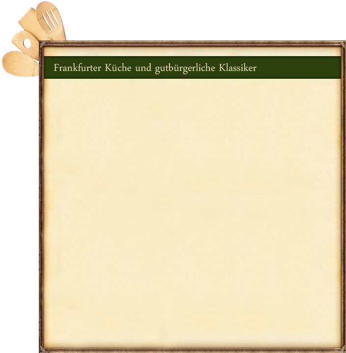 Vom Klassiker wie „Handkäs mit Musik“ über „schwäbische Käsespätzle“, bietet unsere Küche eine Auswahl an hessischen und deutschen Köstlichkeiten. Neben der Frankfurter-Küche und typischen deutschen Klassikern, finden auch internationale Gerichte Ihren Weg auf unsere Karte und vervollständigen so unser Angebot.