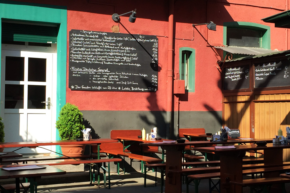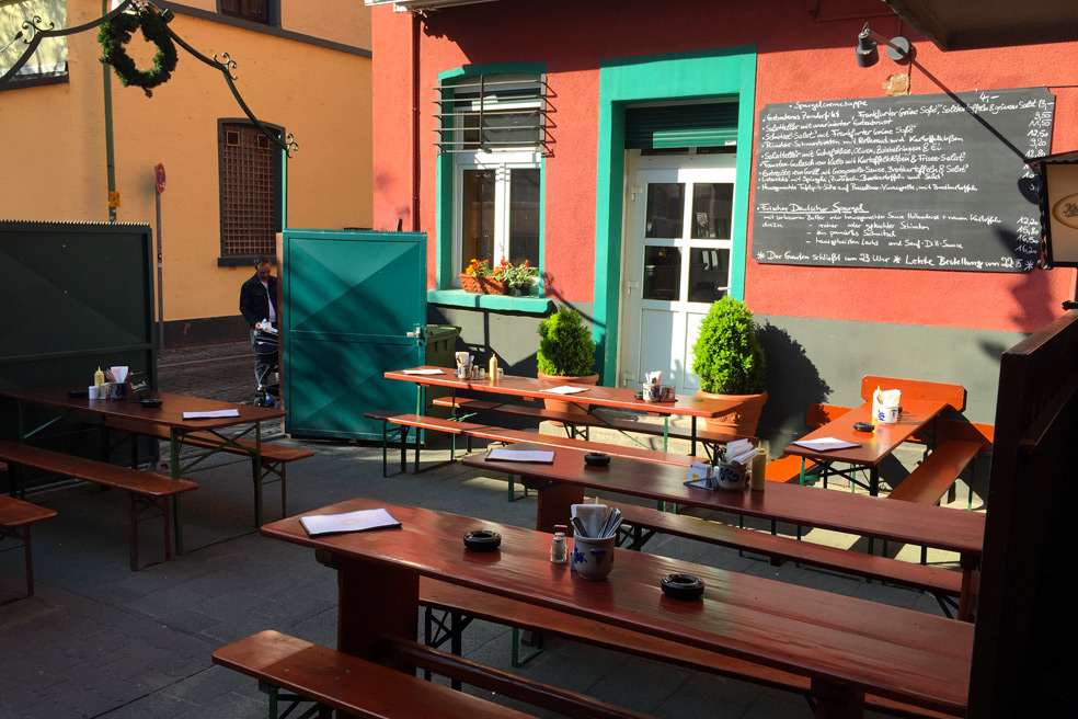An warmen schönen Tagen lässt es sich gemütlich unter der großen, schattenspendenden Platane im Apfelweingarten vor dem Lokal sitzen. Sollte es doch mal einen kleinen Schauer geben, dann sorgen Markisen dafür, dass man sitzen bleiben kann. An 12 großen Tischen finden ca. 100 Gäste Platz.